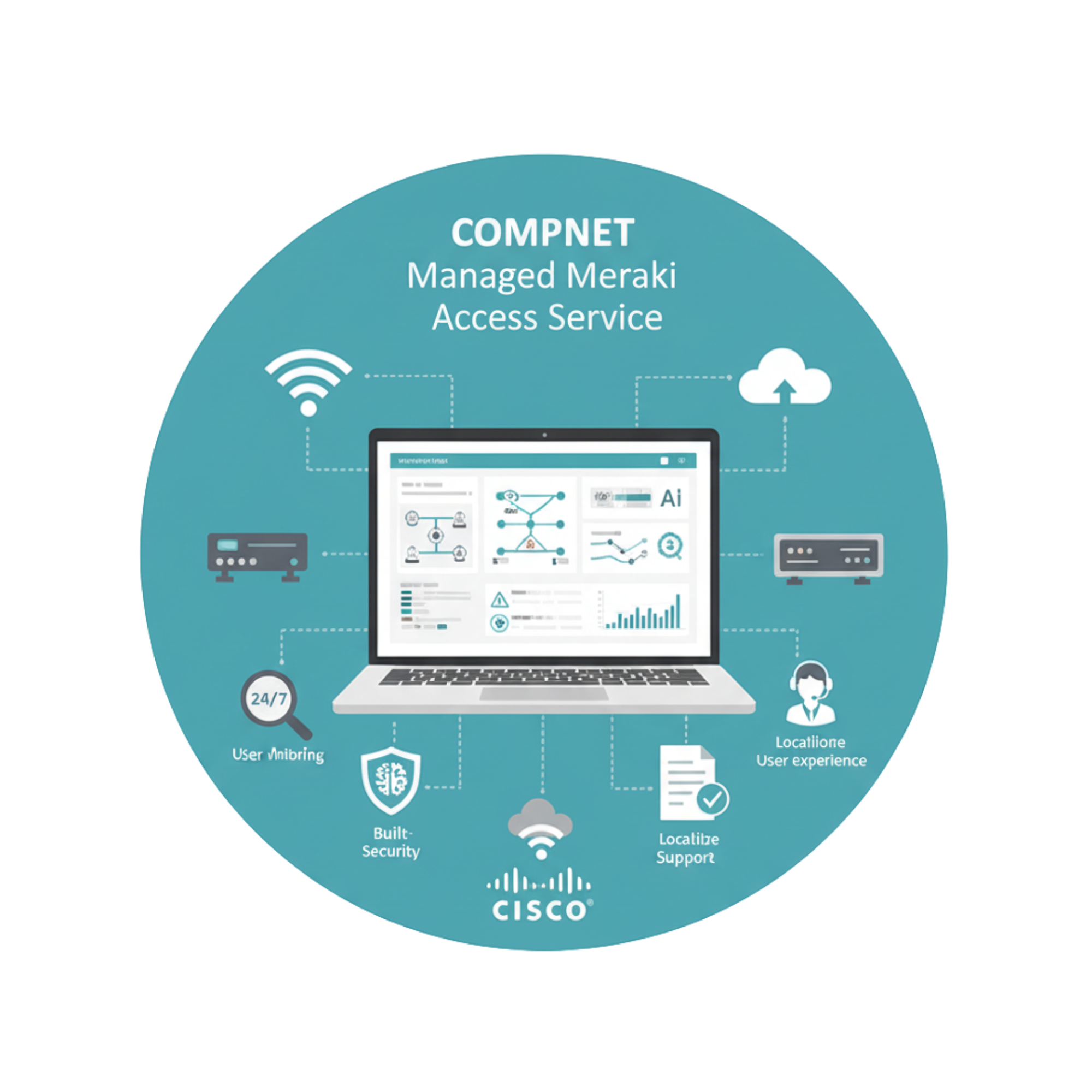 Our service combines Meraki’s intuitive dashboard, zero-touch deployment, AI-driven insights, and built-in security with Compnet’s 24/7 monitoring, compliance expertise, and localized support. This means better IT efficiency, stronger compliance, and seamless connectivity for employees, guests, and IoT devices.
